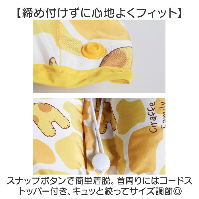 ・スナップボタンで簡単着脱。首周りにはコードストッパー付き、キュッと絞ってサイズ調節◎