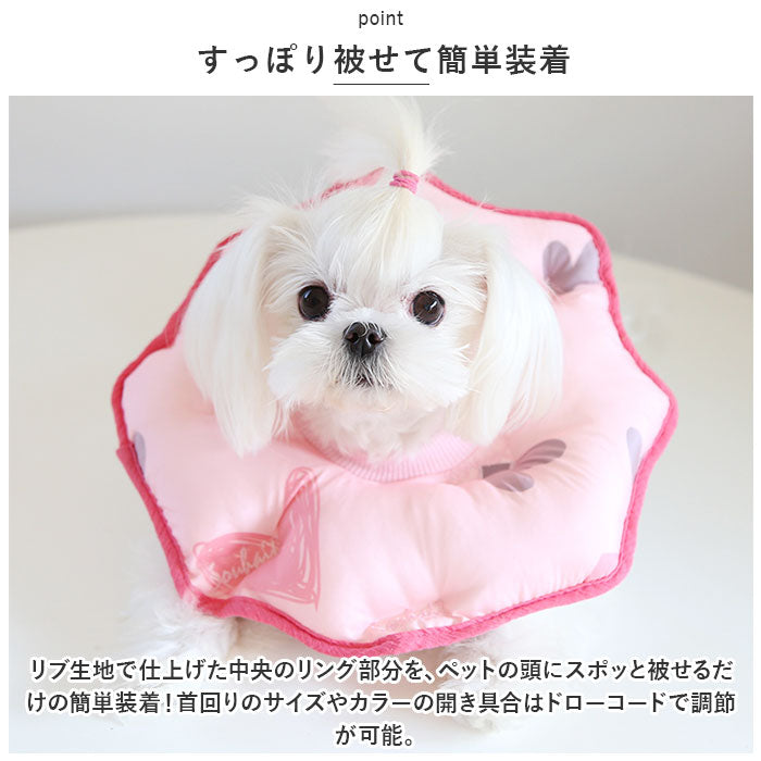 ・リブ生地で仕上げた中央のリング部分を、ペットの頭にスポッと被せるだけの簡単装着!首回りのサイズやカラーの開き具合はドローコードで調節が可能。