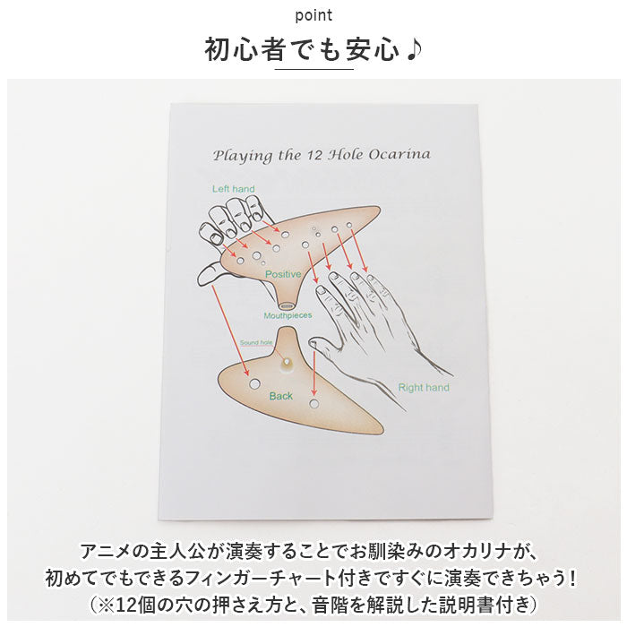 ・アニメの主人公が演奏することでお馴染みのオカリナが、初めてでもできるフィンガーチャート付きですぐに演奏できちゃう!(※12個の穴の押さえ方と、音階を解説した説明書付き)