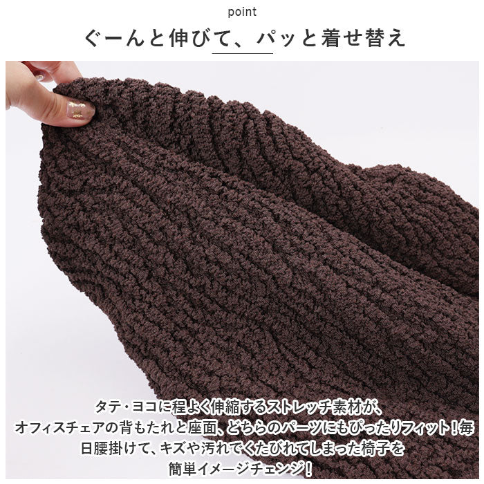 ・タテ・ヨコに程よく伸縮するストレッチ素材が、オフィスチェアの背もたれと座面、どちらのパーツにもぴったりフィット!毎日腰掛けて、キズや汚れでくたびれてしまった椅子を簡単イメージチェンジ!