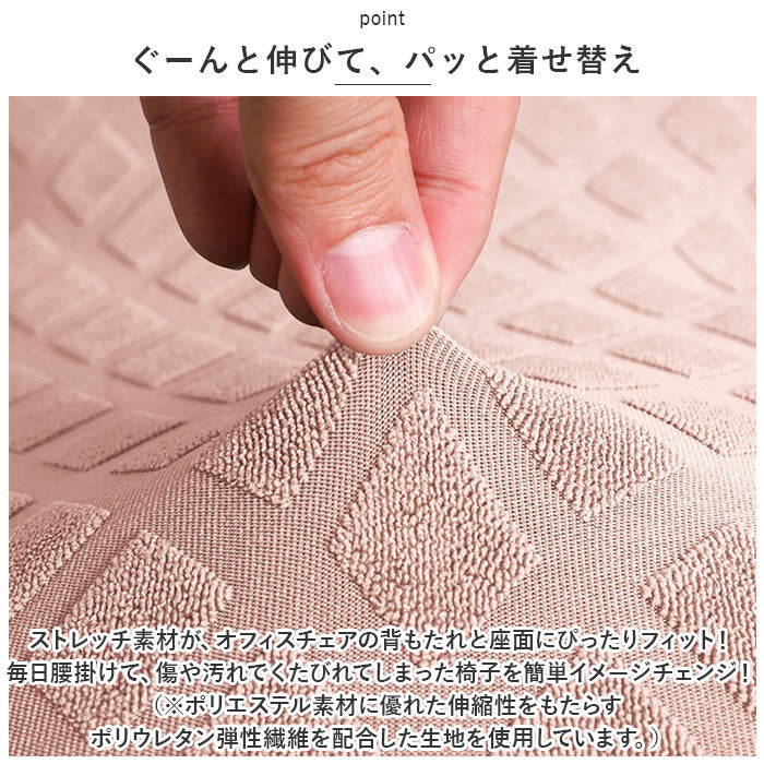 ・タテ・ヨコに程よく伸縮するストレッチ素材が、オフィスチェアの背もたれと座面、どちらのパーツにもぴったりフィット!毎日腰掛けて、キズや汚れでくたびれてしまった椅子を簡単イメージチェンジ!(※ポリエステル素材に優れた伸縮性をもたらすポリウレタン弾性繊維を配合した生地を使用しています。)