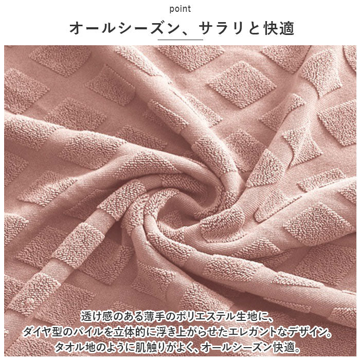 ・透け感のある薄手のポリエステル生地に、ダイヤ型のパイルを立体的に浮き上がらせたエレガントなデザイン。タオル地のように肌触りがよく、オールシーズン快適。
