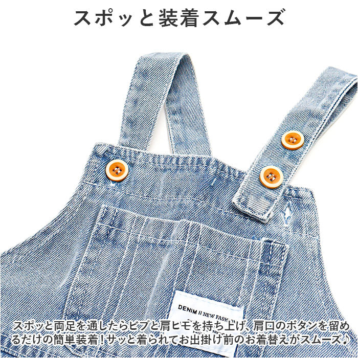 ・スポッと両足を通したらビブと肩ヒモを持ち上げ、肩口のボタンを留めるだけの簡単装着!サッと着られてお出掛け前のお着替えがスムーズ♪
