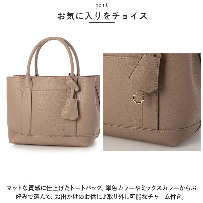 ・マットな質感に仕上げたトートバッグ。単色カラーやミックスカラーからお好みで選んで、お出かけのお供に♪取り外し可能なチャーム付き。