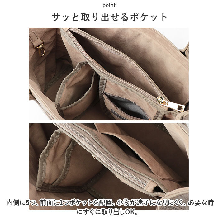 ・内側に5つ、前面に1つポケットを配置。小物が迷子になりにくく、必要な時にすぐに取り出しOK。