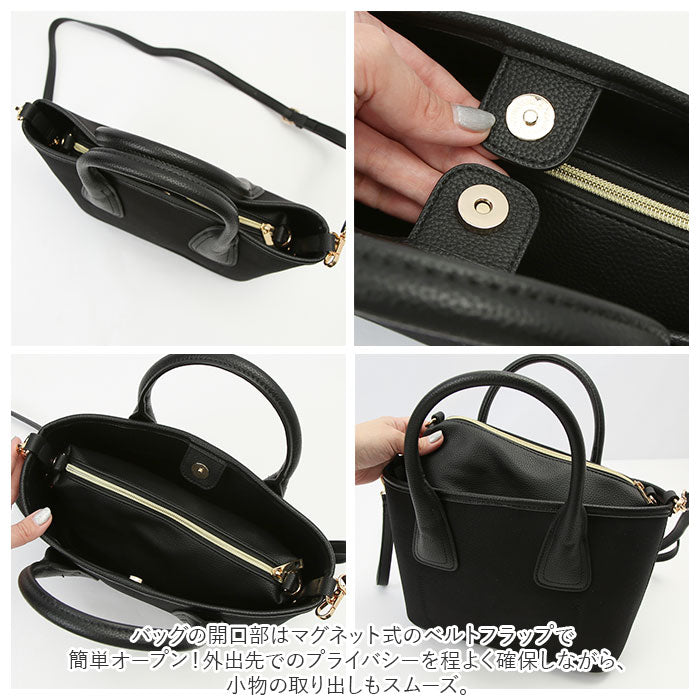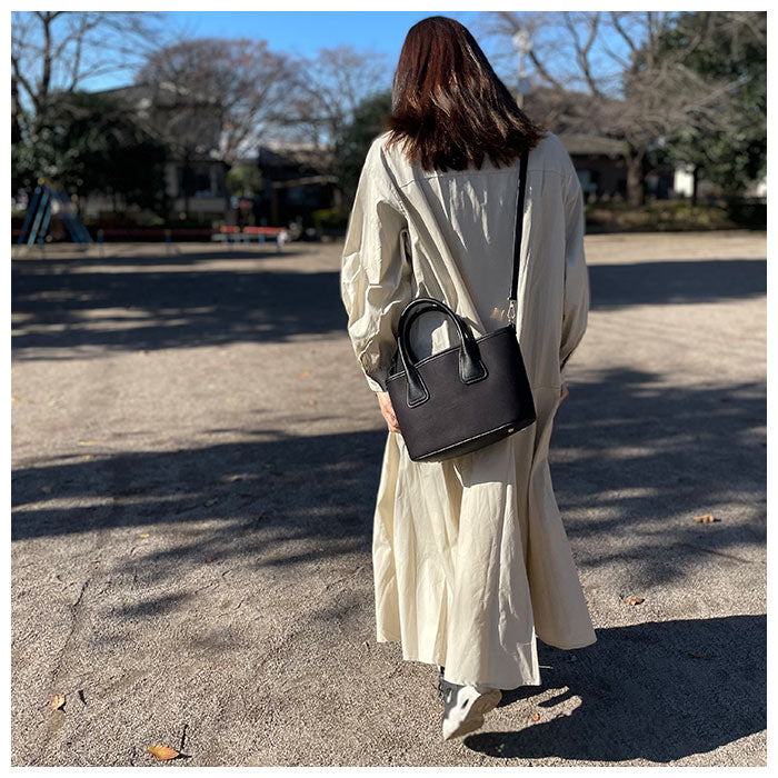 ・取り外しのできるショルダーベルトで肩掛けスタイルにできるのはもちろん、シンプルな手提げハンドバッグにもなる2WAY仕様。
