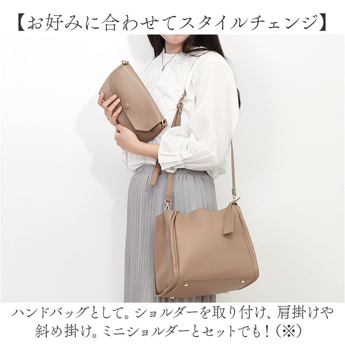・ハンドバッグとして。ショルダーを取り付け、肩掛けや斜め掛け。ミニショルダーとセットでも!