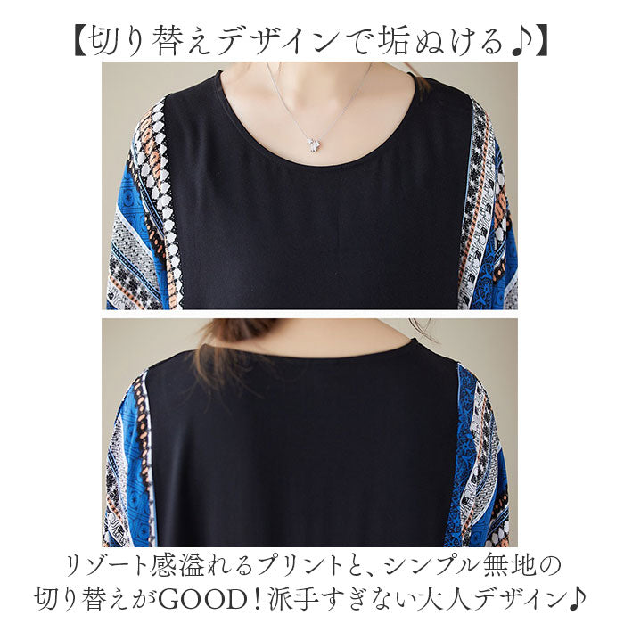 ・リゾート感溢れるプリントと、シンプル無地の切り替えがGOOD!派手すぎない大人デザイン♪