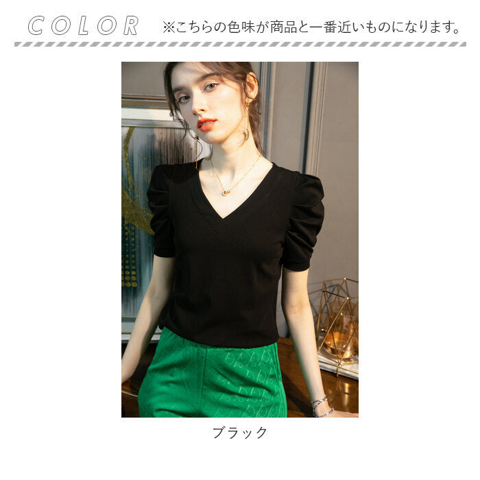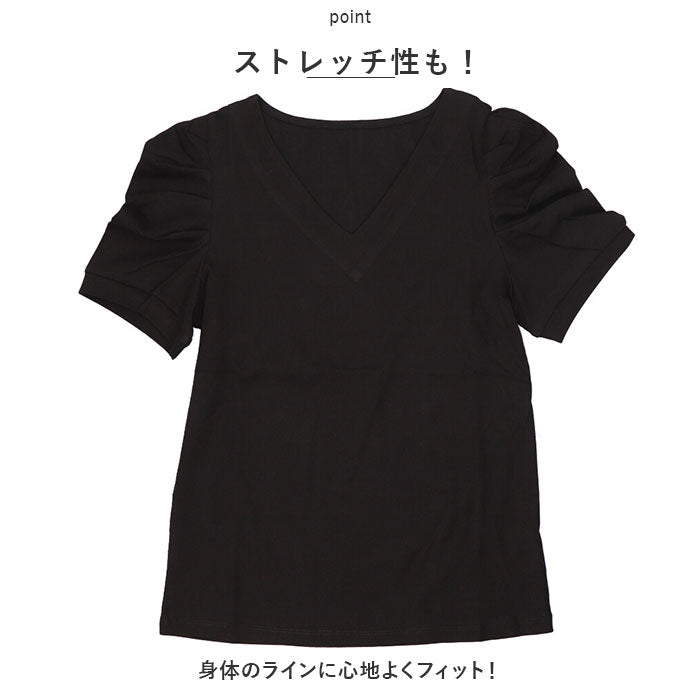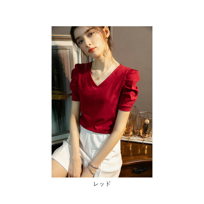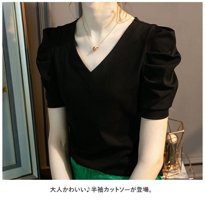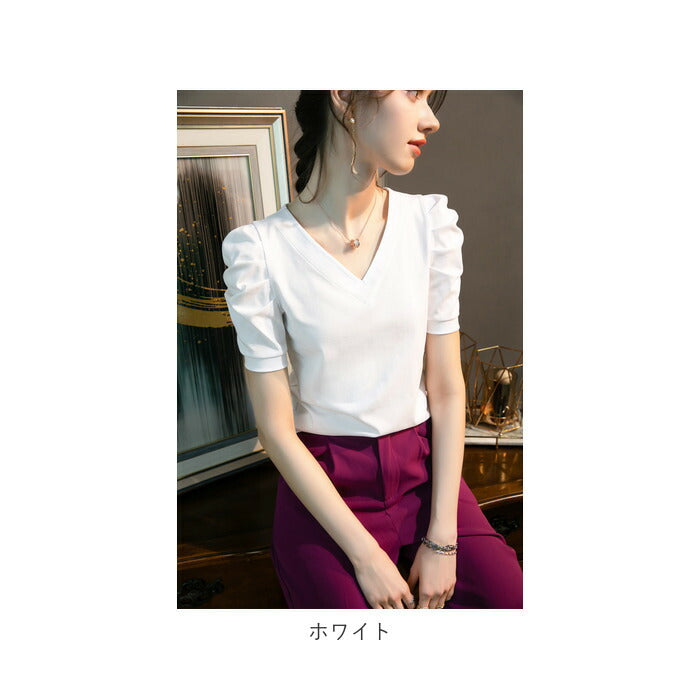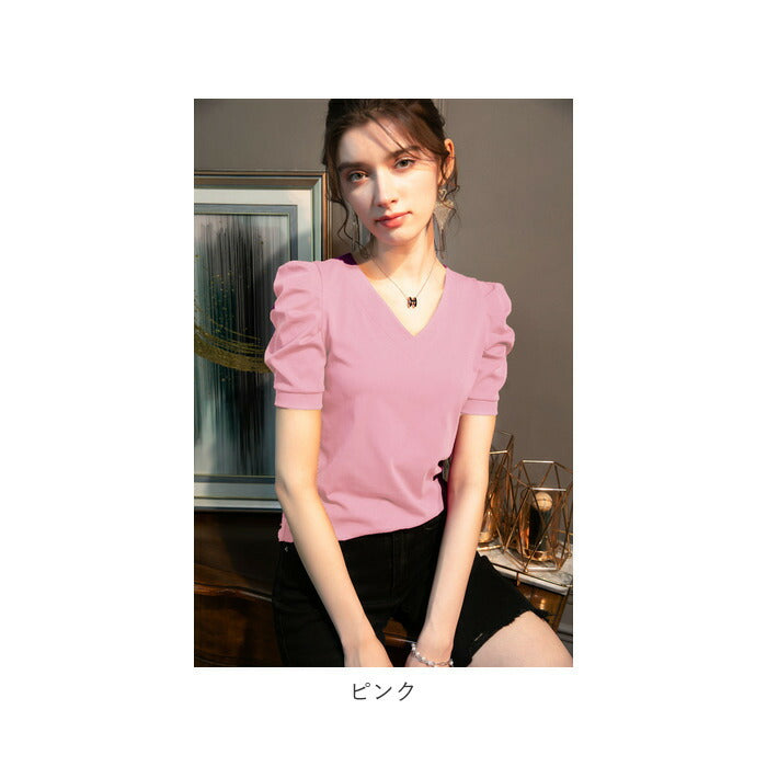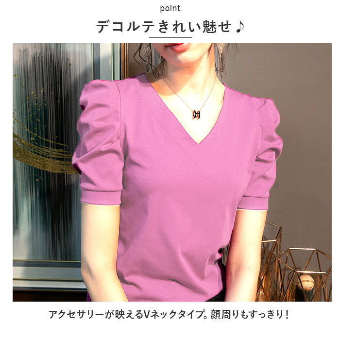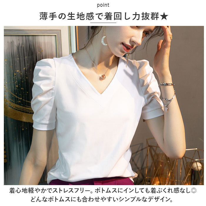 カットソー 半袖 レディース 通販 パフスリーブ tシャツ バルーン バルーン袖 きれいめ 上品 エレガント vネック レディーストップス おしゃれ お洒落 かわいい 可愛い 大人 カジュアル トップス 春 夏 オフィスカジュアル お出かけ