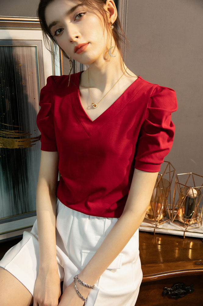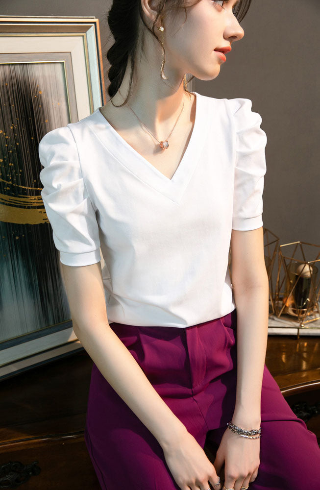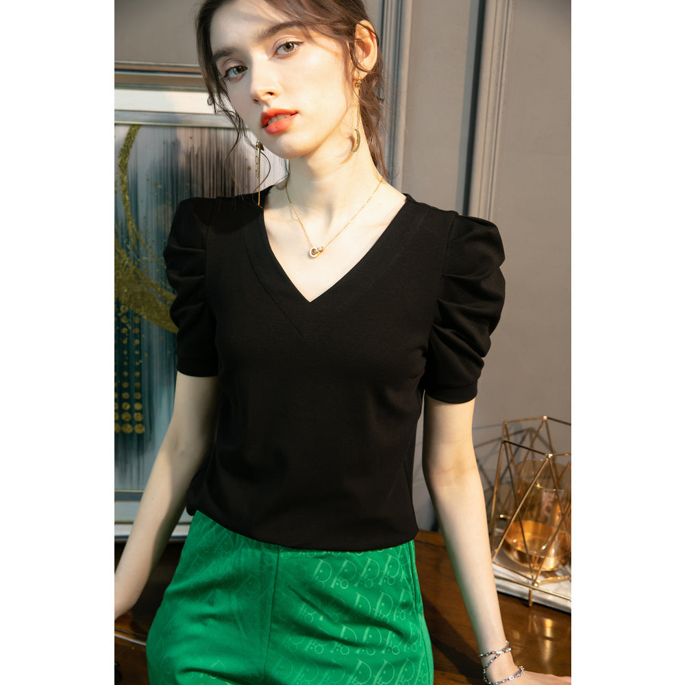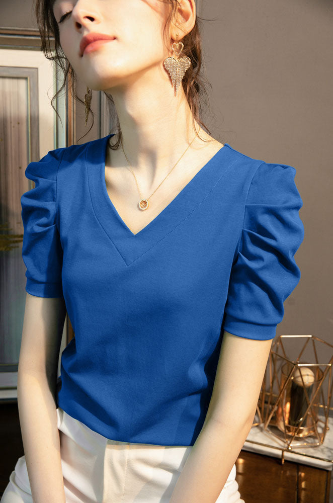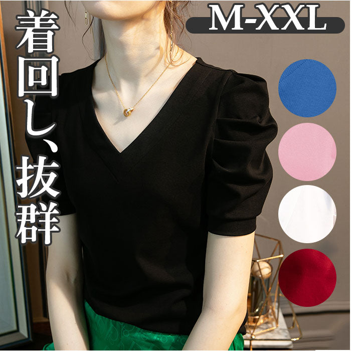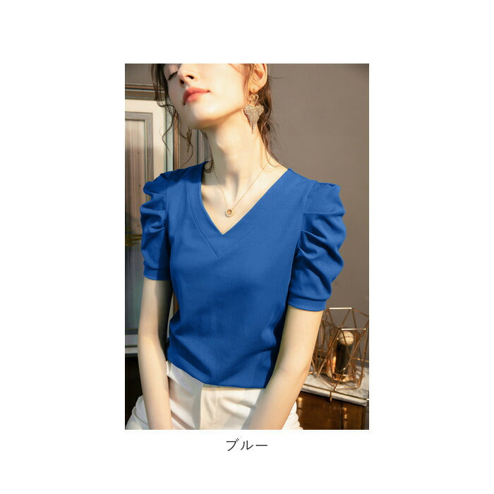 カットソー 半袖 レディース 通販 パフスリーブ tシャツ バルーン バルーン袖 きれいめ 上品 エレガント vネック レディーストップス おしゃれ お洒落 かわいい 可愛い 大人 カジュアル トップス 春 夏 オフィスカジュアル お出かけ