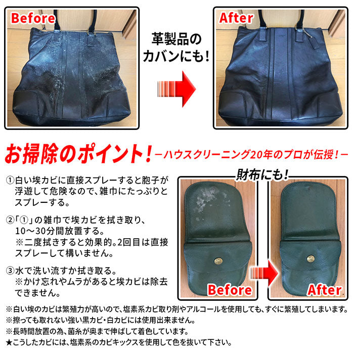 ・畳、タンス、押入れ、下駄箱、家具、ベッド等、普段カビ取りできない場所にも使える埃カビ専用カビ取り剤。(※擦っても色が取れないカビには使えません。)