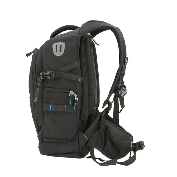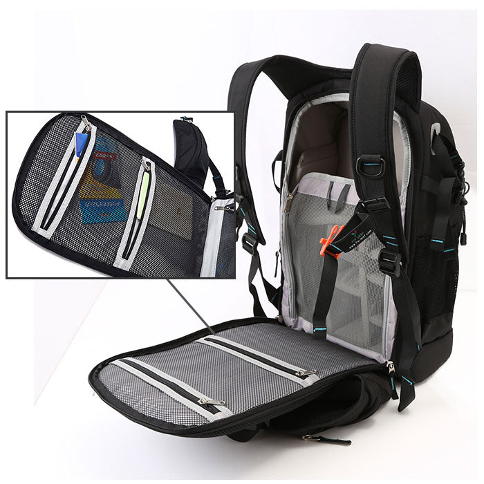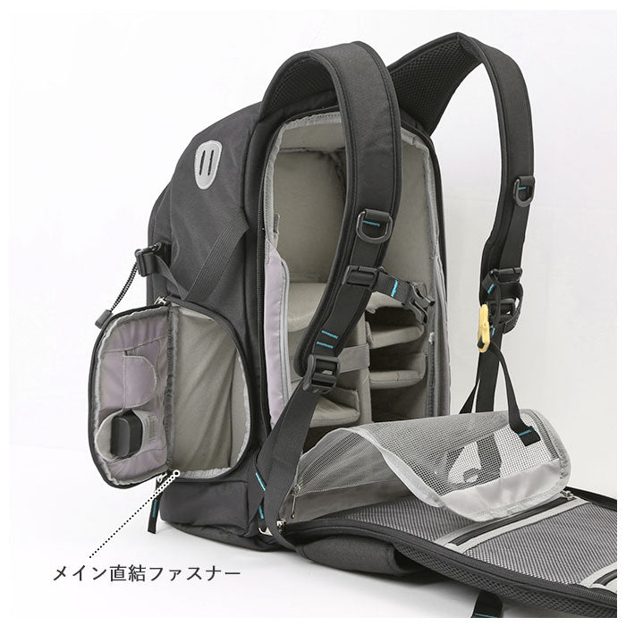 ・メイン収納は背面部分から開けるタイプ。ラウンドファスナーになっているので中身がしっかり見える仕様。ベルクロタイプの便利なクッションタイプの仕切りを活用することで、使っている機材やレンズに合わせて収納スペースを自由に区切ることが可能。収納部を覆うカバーはメッシュ素材なので通気性が良く、大切な機材を守ってくれる。