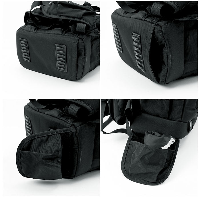 ・サイドのファスナーポケットはメインに直結しているので中の荷物をサッと取り出したい時に便利。面ファスナー付きのフラップポケット×2はメモリーカード類の収納に便利。もう一方のサイドはメッシュポケットになっていて水筒などを入れられる。