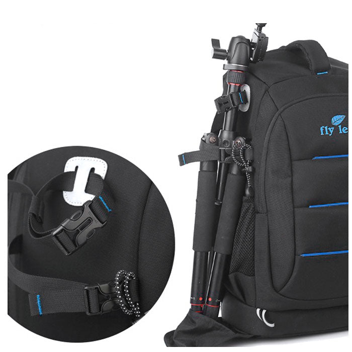 ・左サイドにある2本のストラップと底面に収納されている三脚の脚を入れるポケットを使えば愛用の三脚もしっかりとホールドしてくれる。