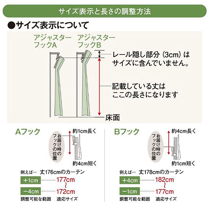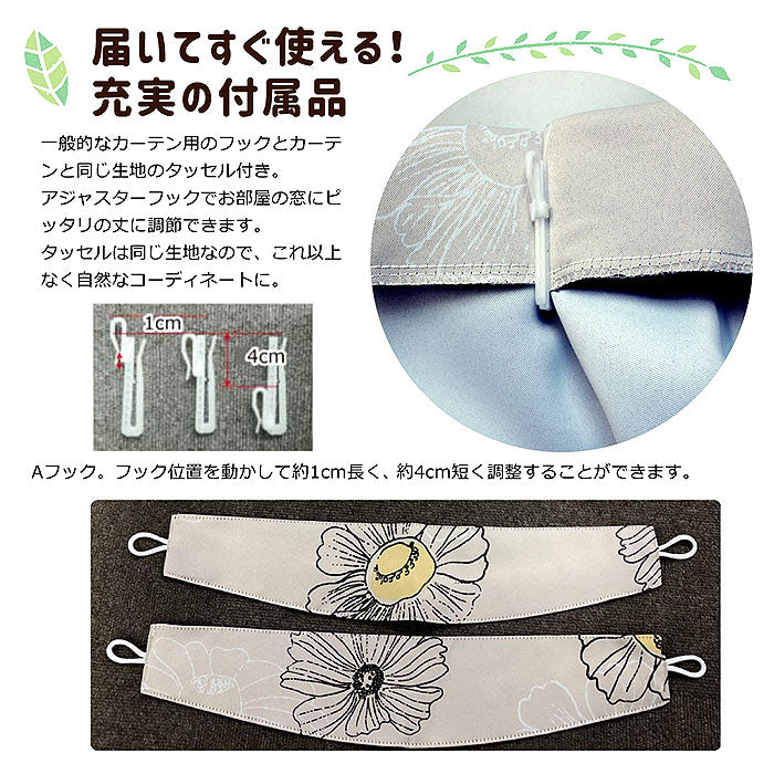 ・カーテン用のアジャスターフックが付属。お部屋の窓のサイズに合わせて、丈感を調節。