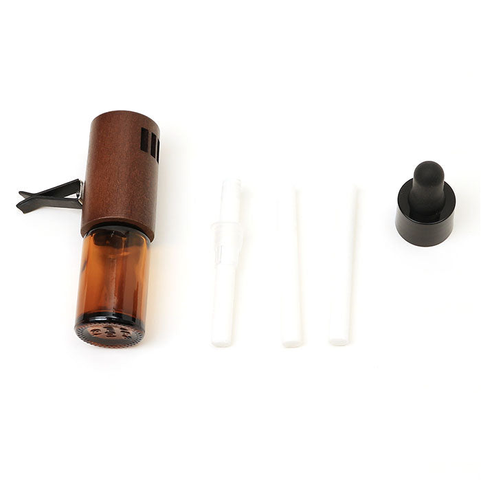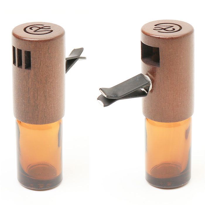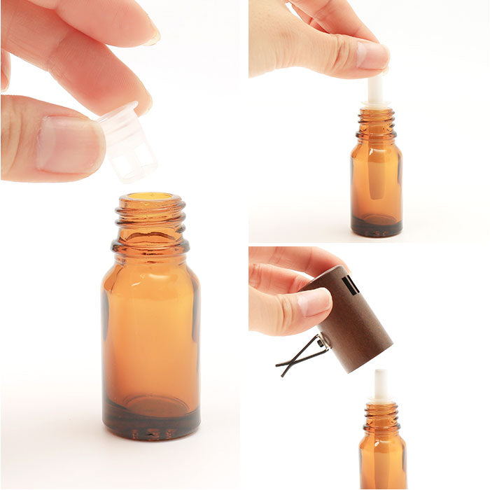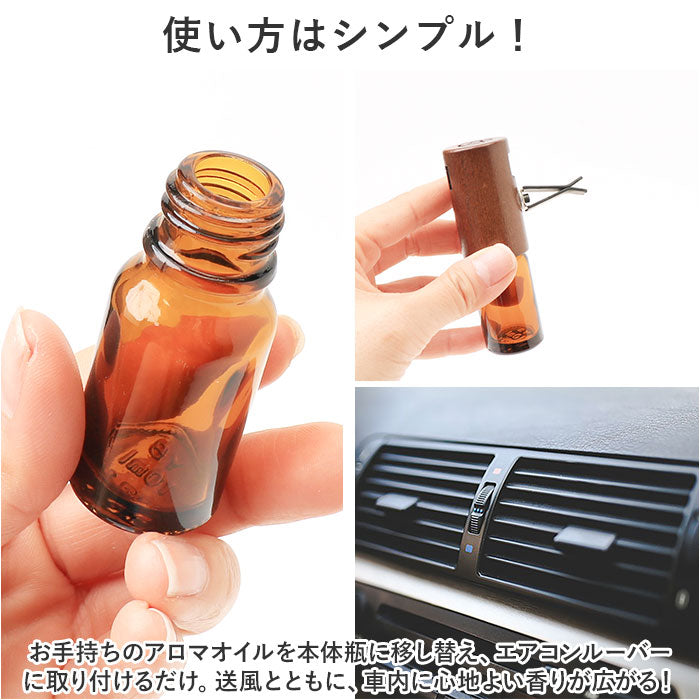 ・お手持ちのアロマオイルを本体瓶に移し替え、エアコンルーバーに取り付けるだけ。送風とともに、車内に心地よい香りが広がる!