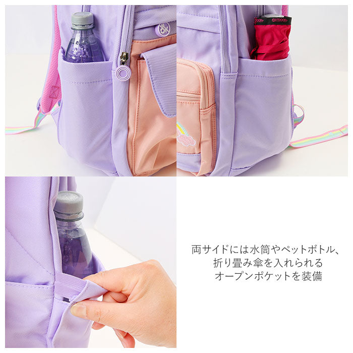 ・両サイドには水筒やペットボトル、折り畳み傘を入れられるオープンポケットを装備。さらに背面にもシークレットポケットが付いている♪