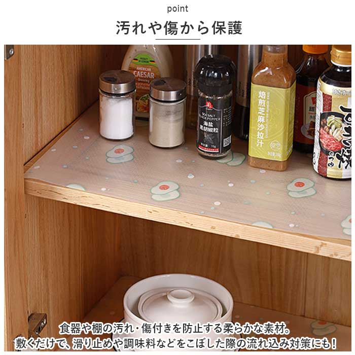 ・食器や棚の汚れ・傷付きを防止する柔らかな素材。敷くだけで、滑り止めや調味料などをこぼした際の流れ込み対策にも!