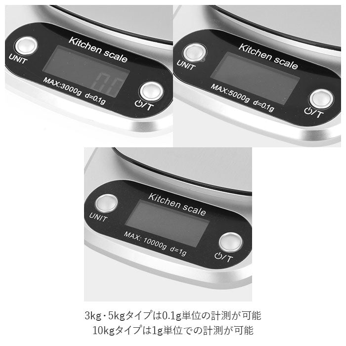 ・3kg・5kgタイプは0.1g単位の計測が可能で10kgタイプは1g単位での計測が可能。