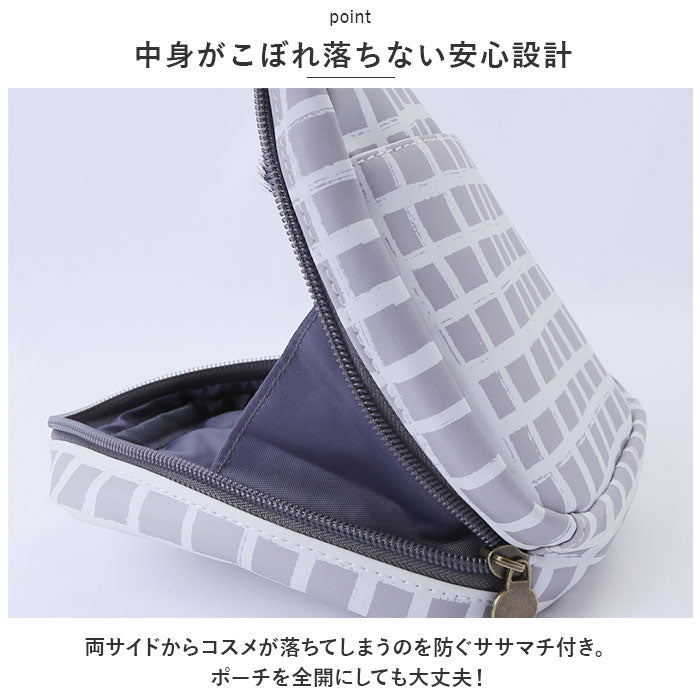 ・両サイドからコスメが落ちてしまうのを防ぐササマチ付き。ポーチを全開にしても大丈夫!