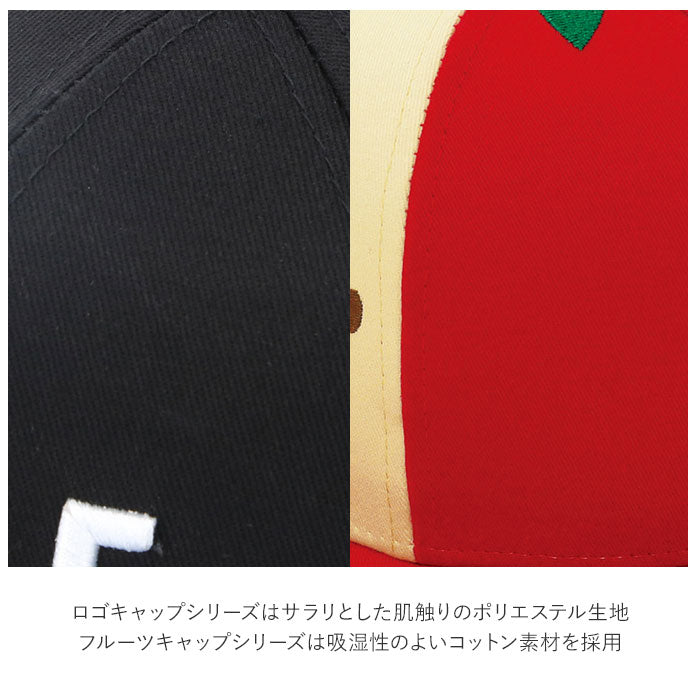 ・ロゴキャップシリーズは、サラリとした肌触りのポリエステル生地。フルーツキャップシリーズは、吸湿性のよいコットン素材を採用。