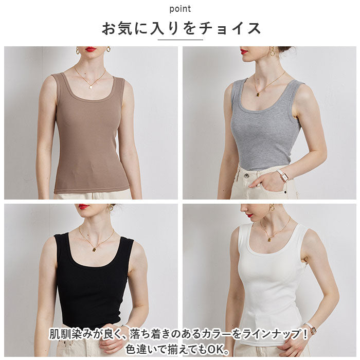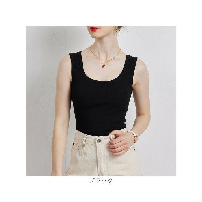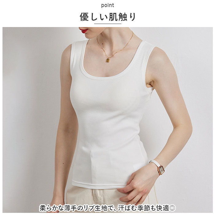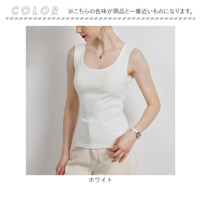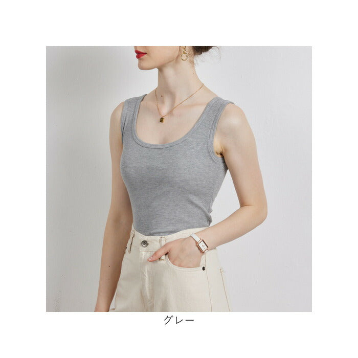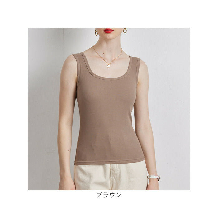 ・袖のないタンクトップタイプ。シアー感のあるシャツなどとレイヤードしたり、部屋着やナイトウェアとしても活躍。