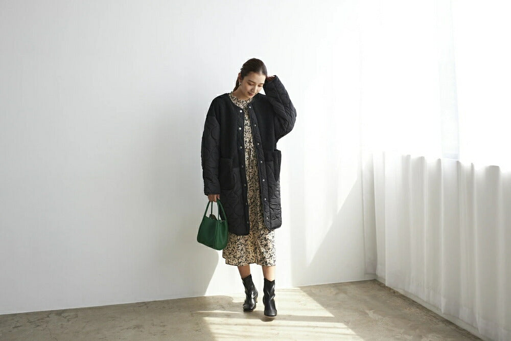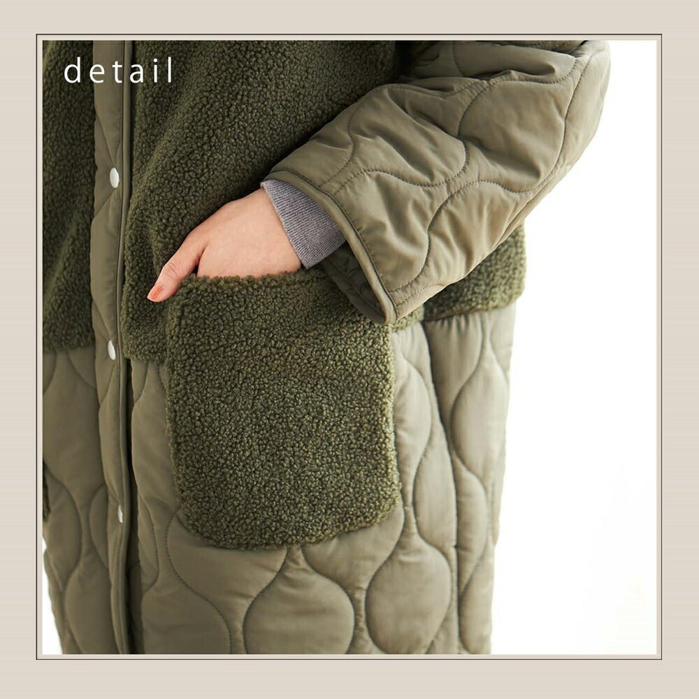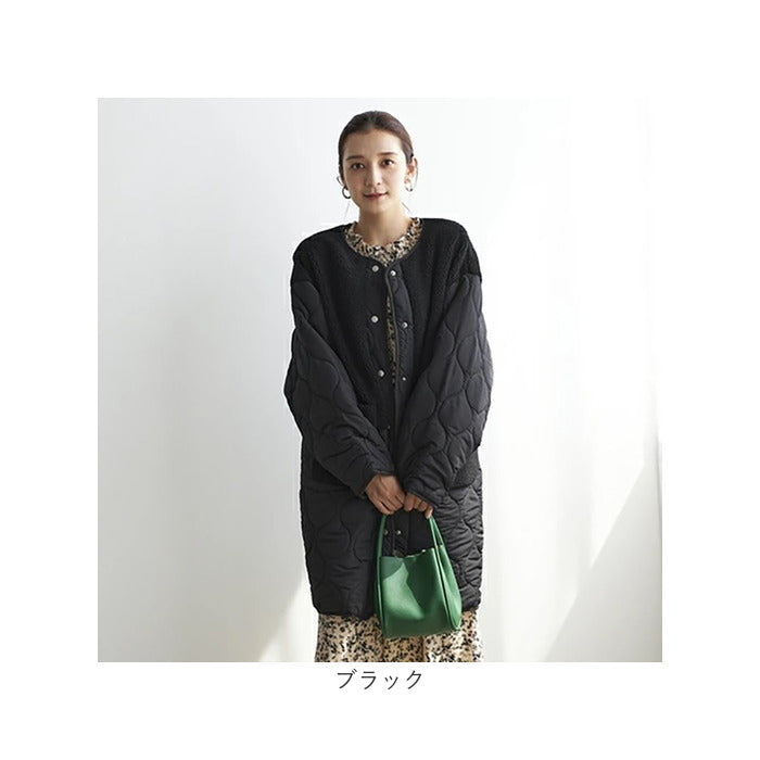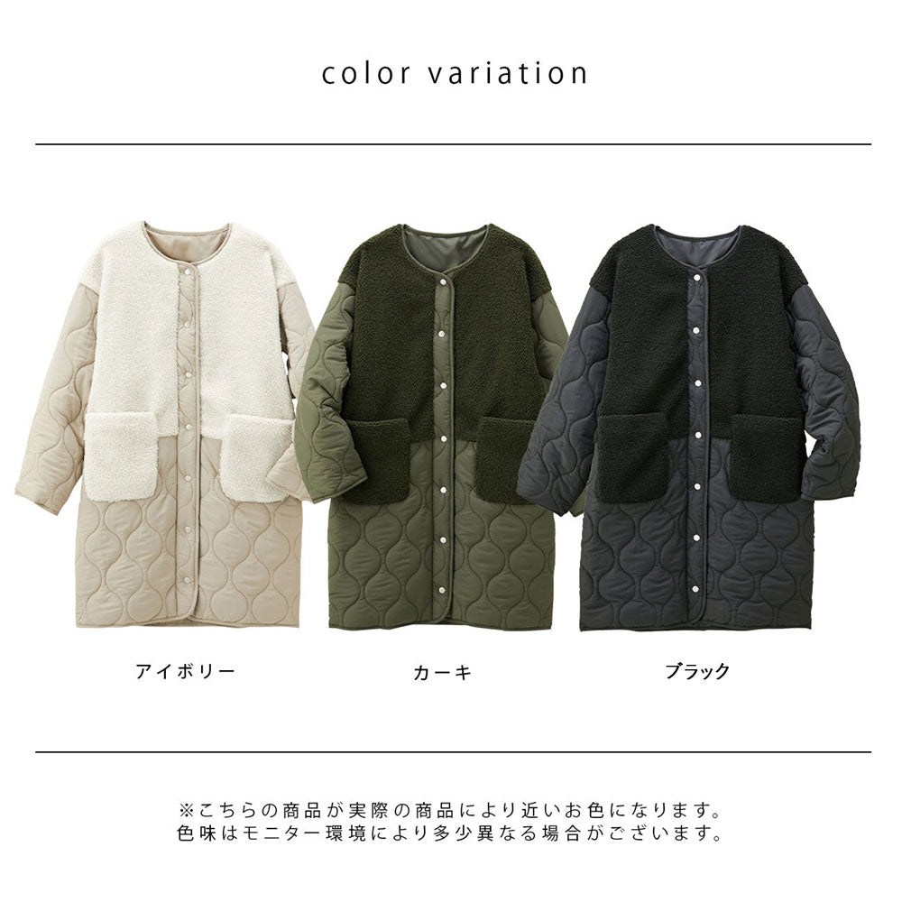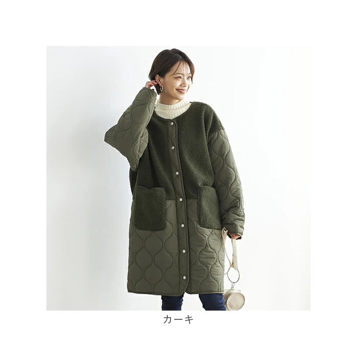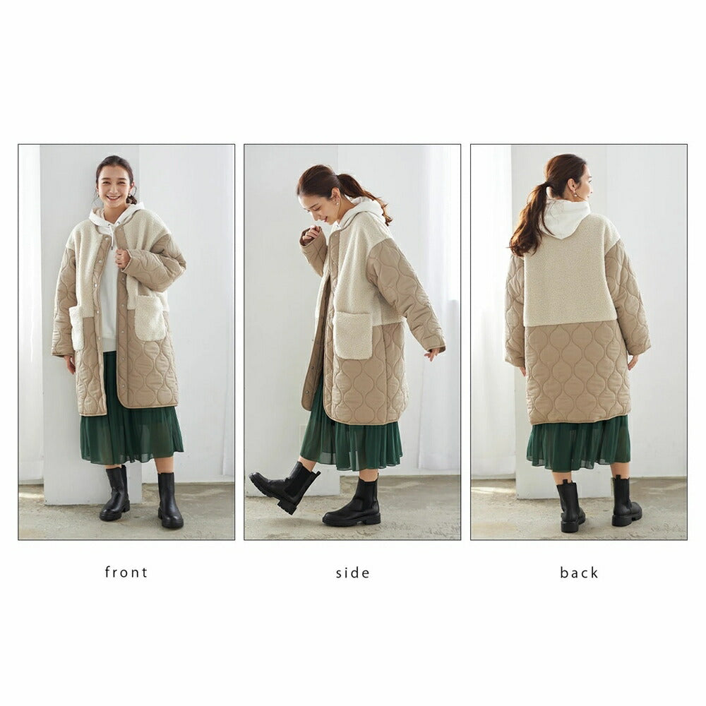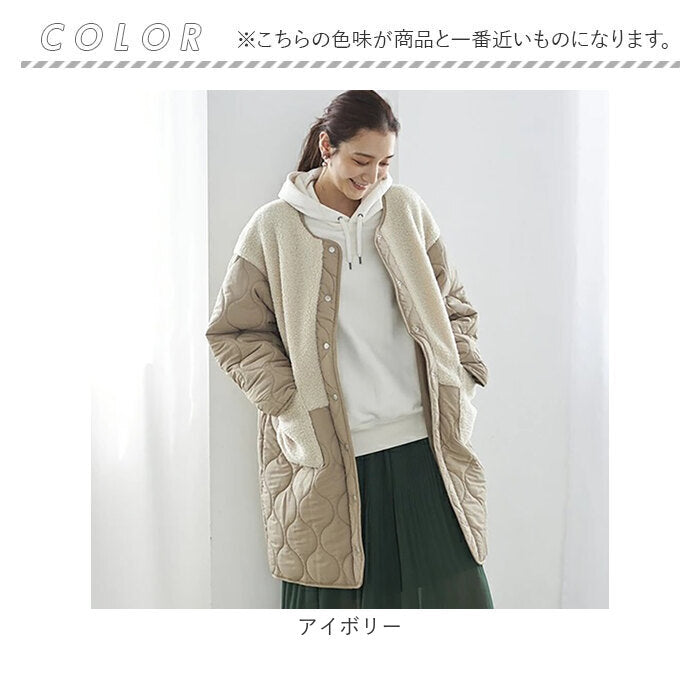 キルティングコート レディース 通販 ノーカラーコート ロングコート ノーカラージャケット 上着 きれいめ 秋 冬 秋冬 切替ボア×ノーカラーロングキルトコート おしゃれ シンプル 大人