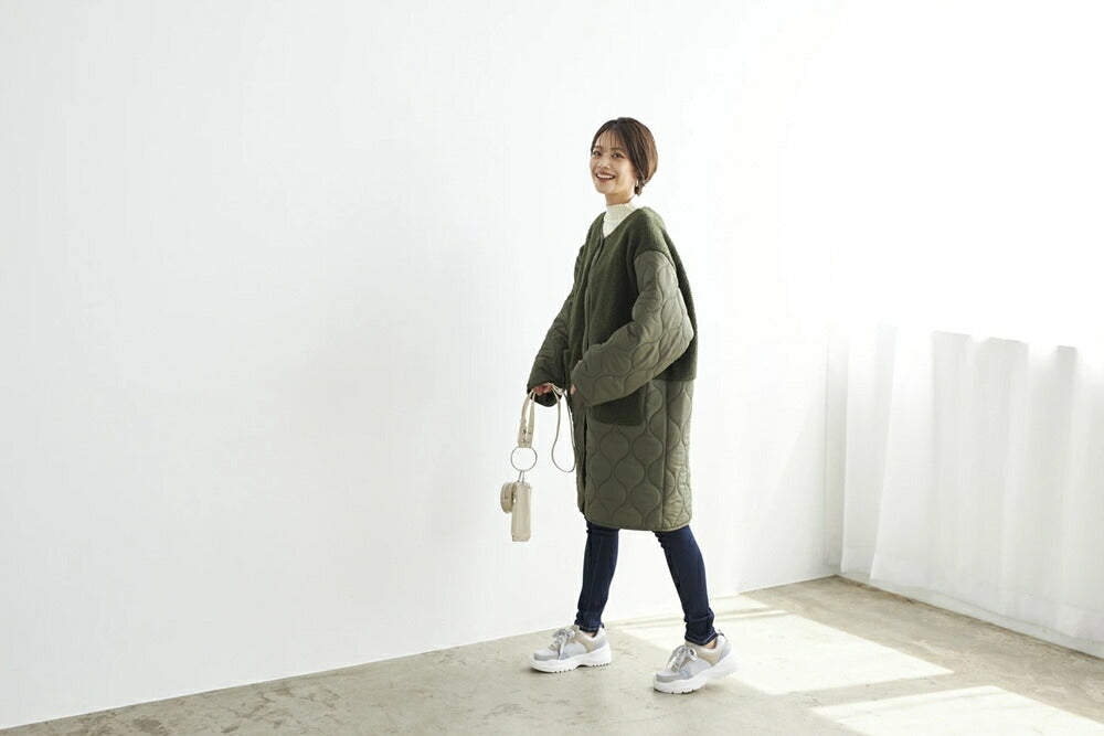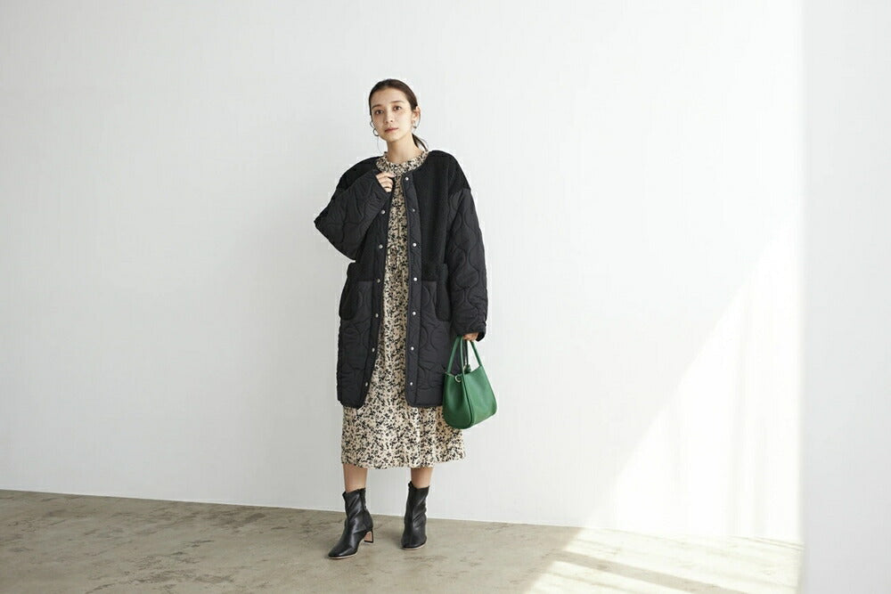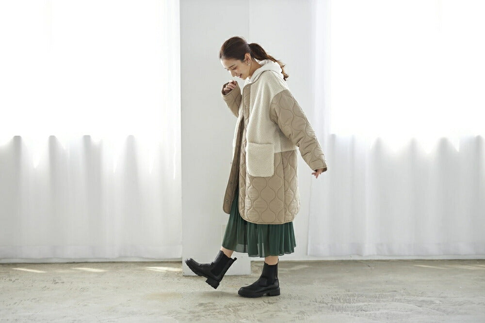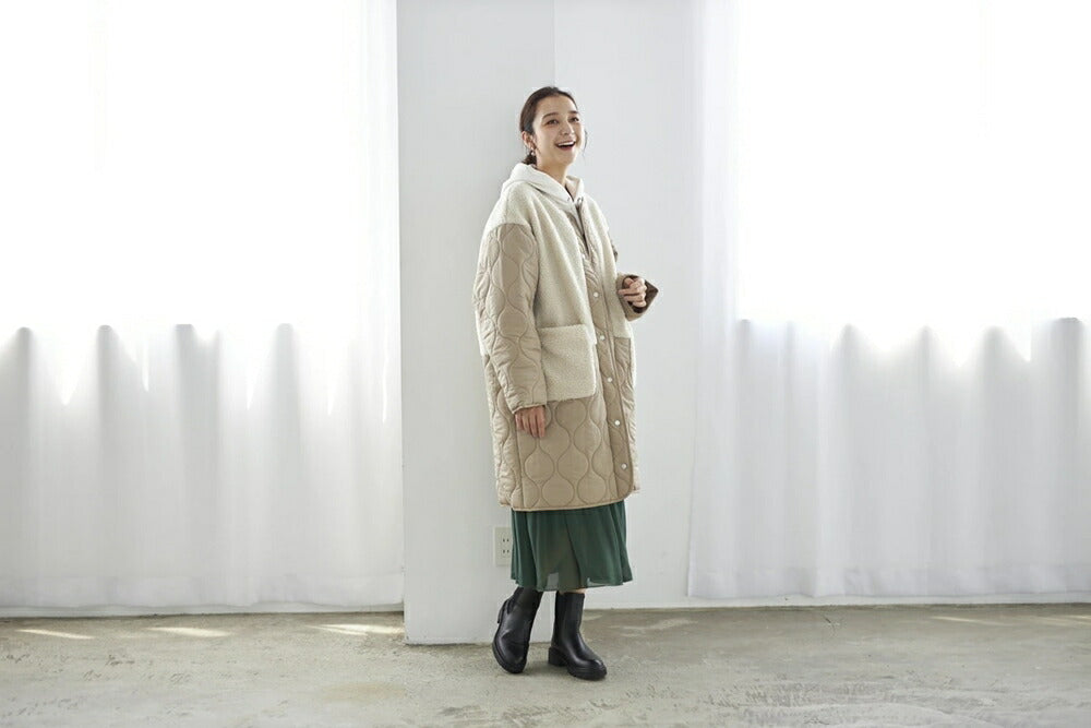 ・もこもこボアと、ひょうたんキルトの切り替えがカワイイ、ロングコートです。