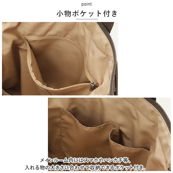 ・メインルーム内にはスマホやハンカチ等、入れる物の大きさに合わせて収納できるポケット付き。