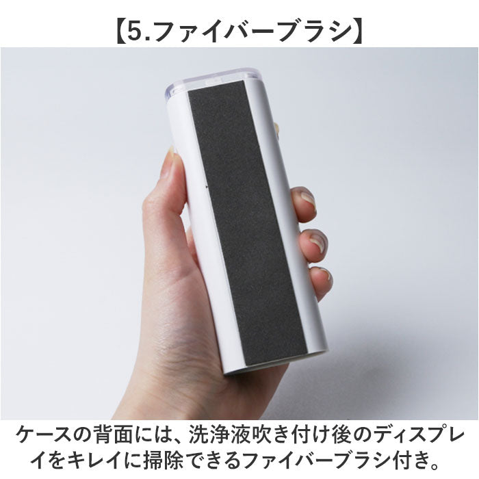 ・ケースの背面には、洗浄液吹き付け後のディスプレイをキレイに掃除できるファイバーブラシ付き。