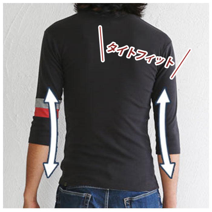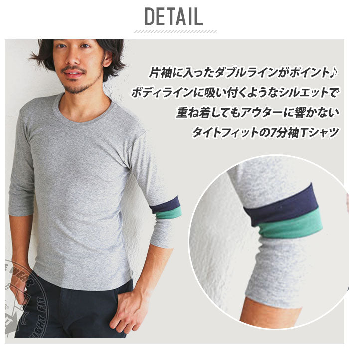 ・片袖に入ったダブルラインがおしゃれのポイント♪ボディラインに吸い付くようなシルエットで、重ね着してもアウターに響かないタイトフィットの7分袖Tシャツ★