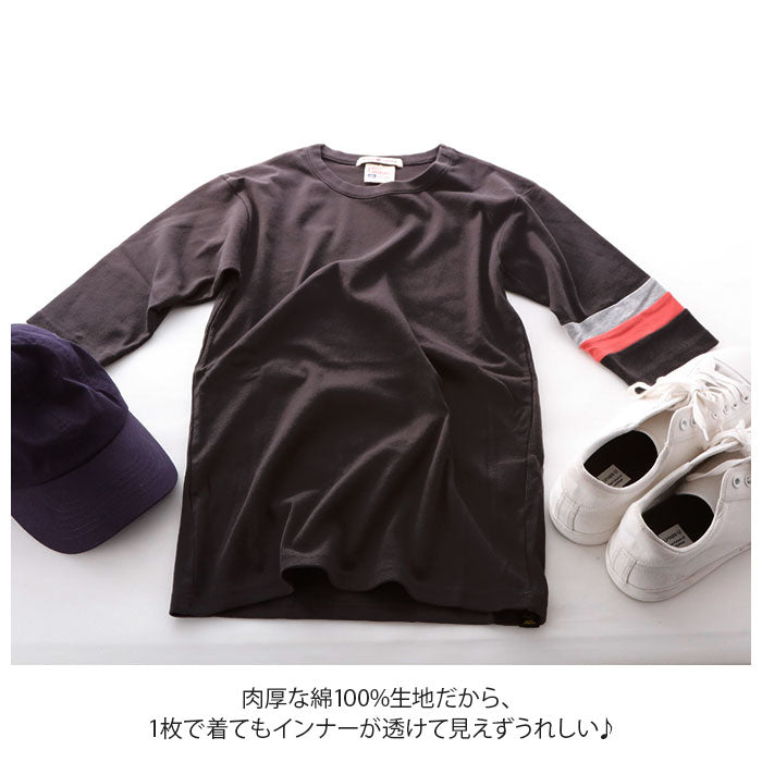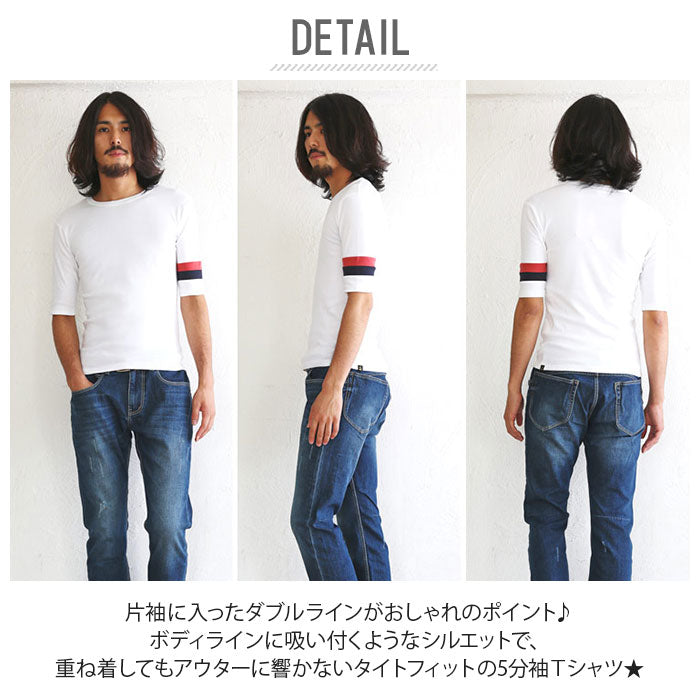 ・片袖に入ったダブルラインがおしゃれのポイント♪ボディラインに吸い付くようなシルエットで、重ね着してもアウターに響かないタイトフィットの5分袖Tシャツ★