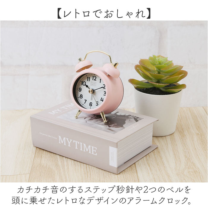 ・カチカチ音のするステップ秒針や2つのベルを頭に乗せたレトロなデザインのアラームクロック。