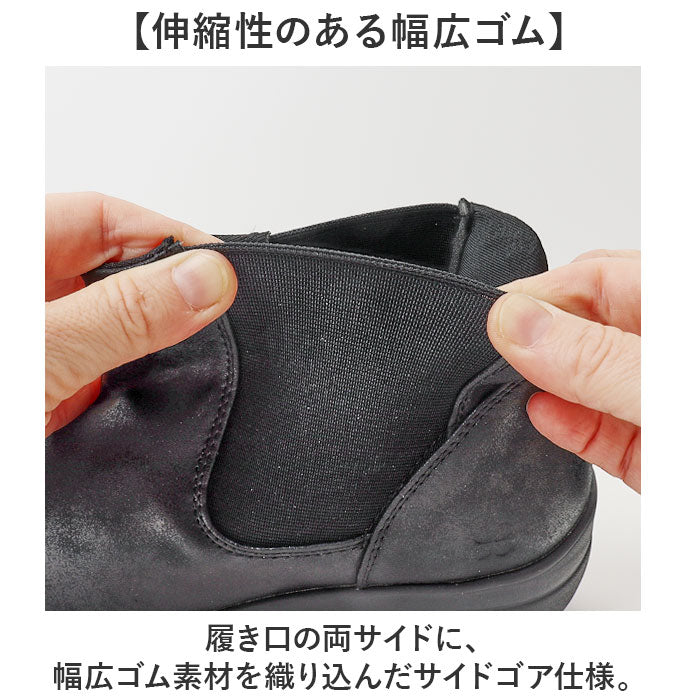 ・履き口の両サイドに、幅広ゴム素材を織り込んだサイドゴア仕様。