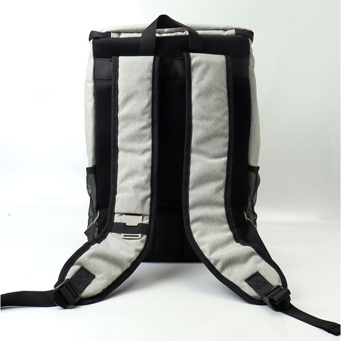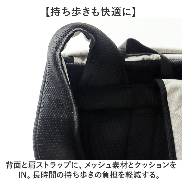 ・背面と肩ストラップに、メッシュ素材とクッションをIN。長時間の持ち歩きの負担を軽減する。