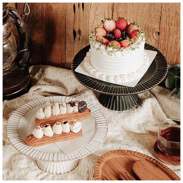 ・プレートにリムデザインを施し、ナチュラルな印象に仕上げたケーキスタンド。