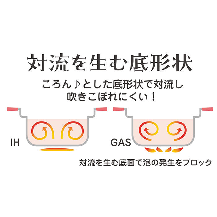 ・ころんとした底形状で対流し吹きこぼれにくい。