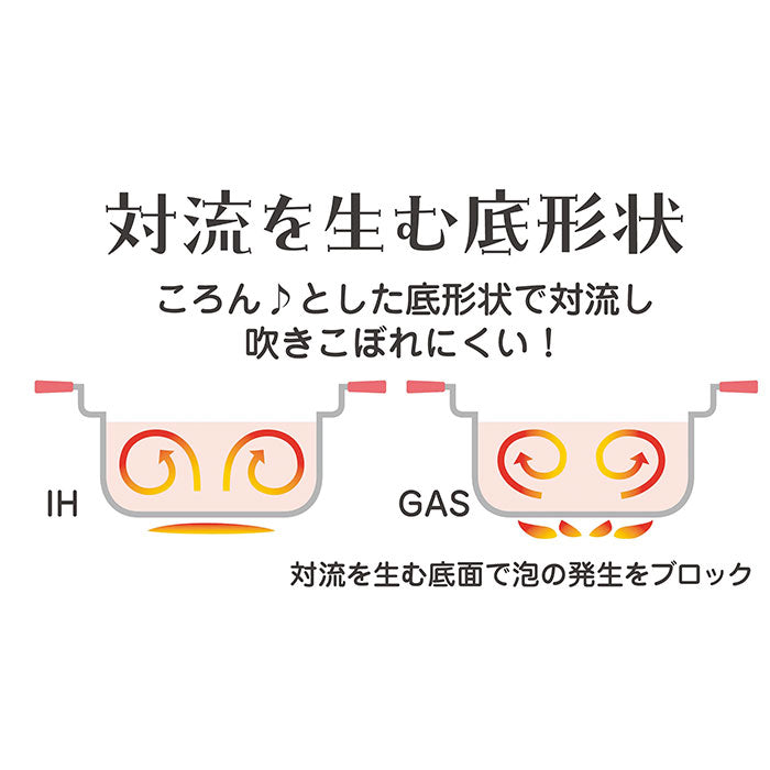・ころんとした底形状で対流し吹きこぼれにくい。