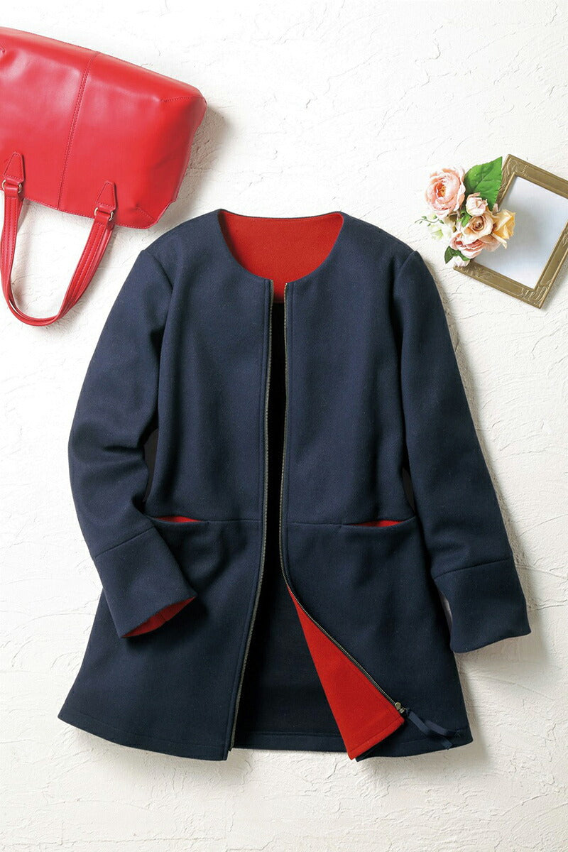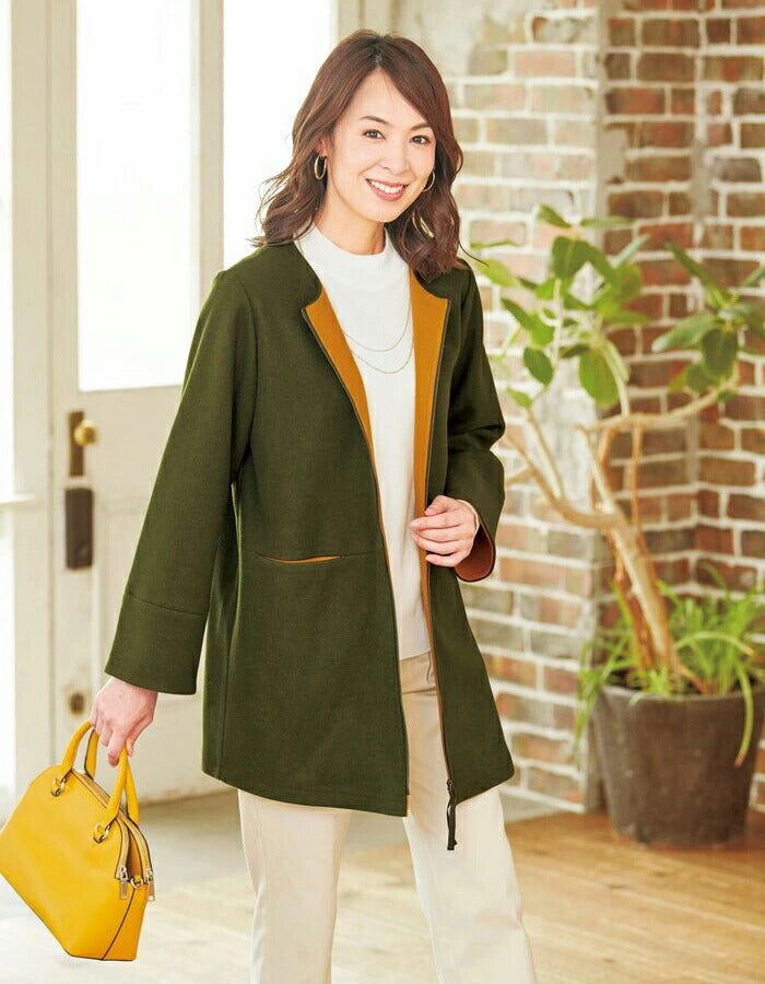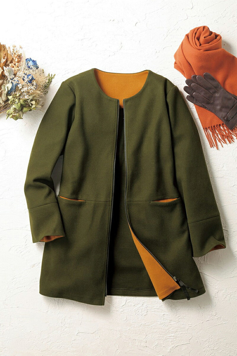 ・温もりのあるウール調素材のノーカラーコート。