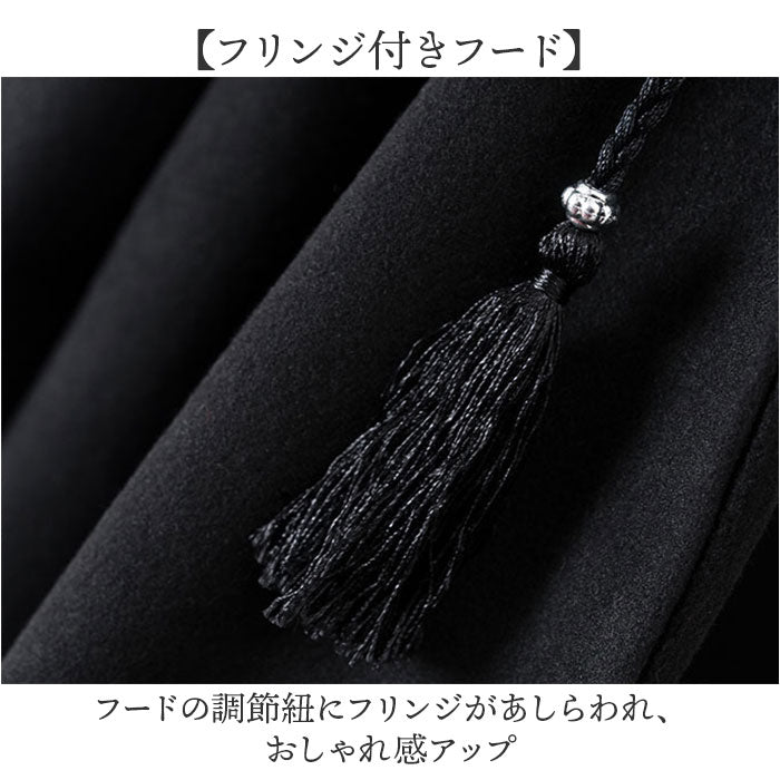 ・フードの調節紐にフリンジがあしらわれ、おしゃれ感アップ