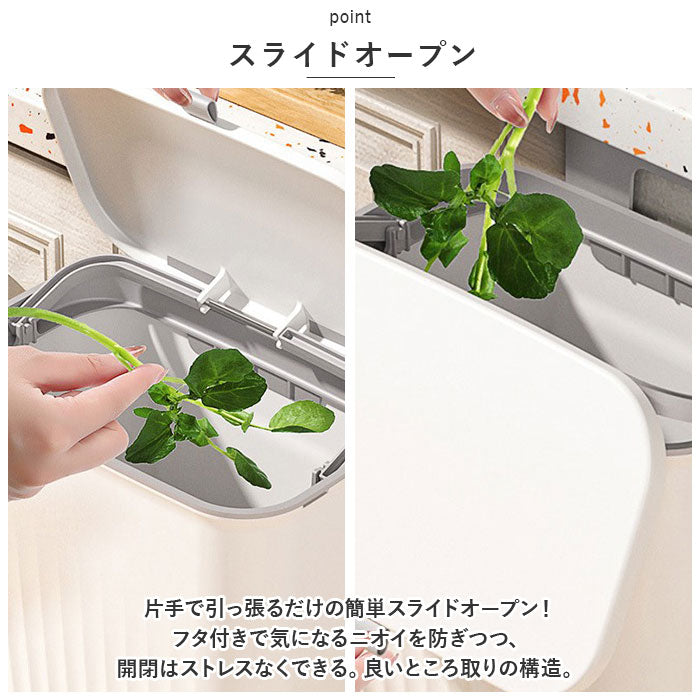 ・ありそうでなかった壁掛けタイプ、片手でスライドオープンOKの、使いやすさにこだわったゴミ箱。毎日のお料理タイムをもっと便利に◎