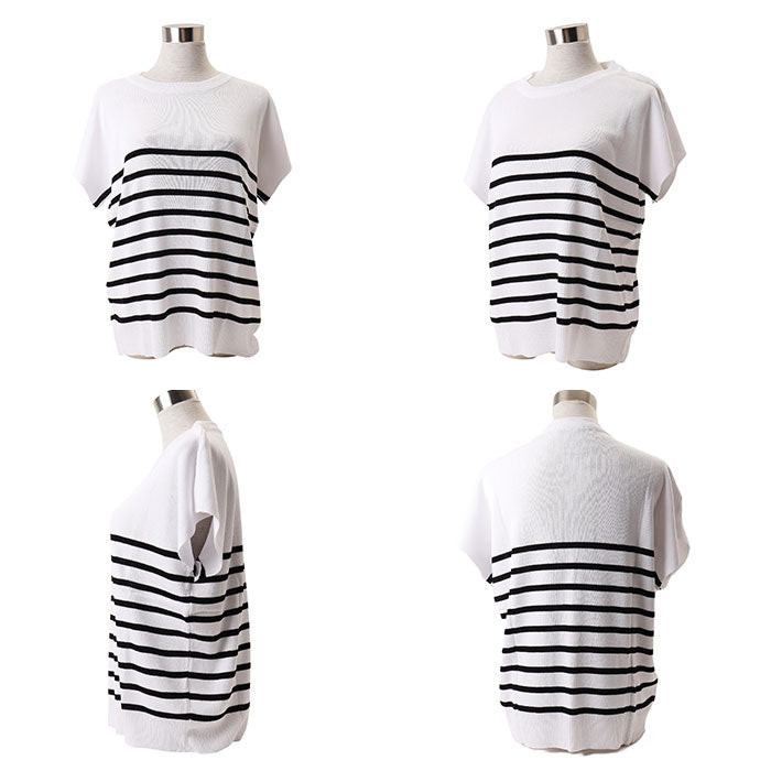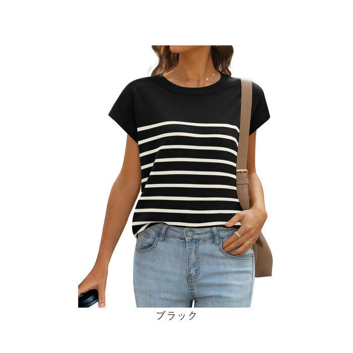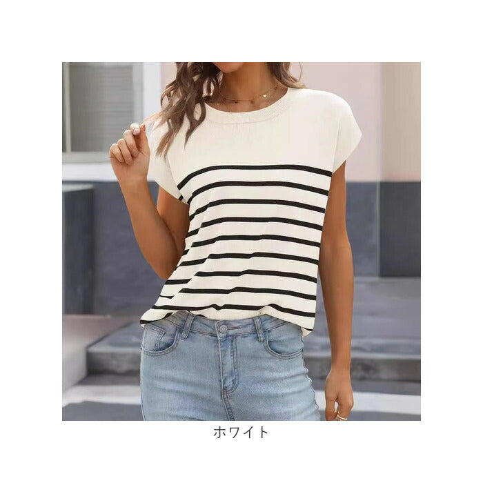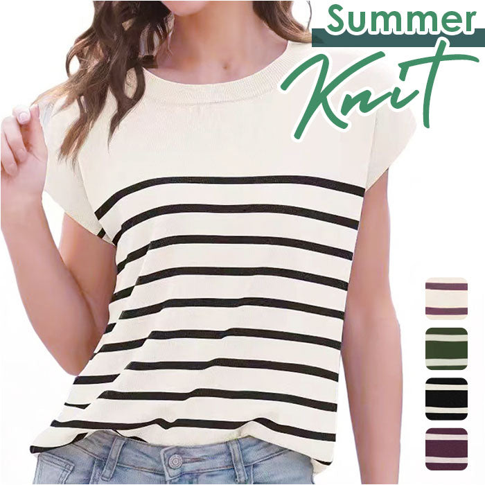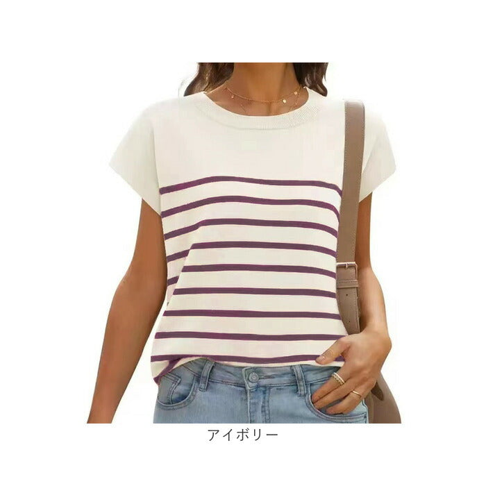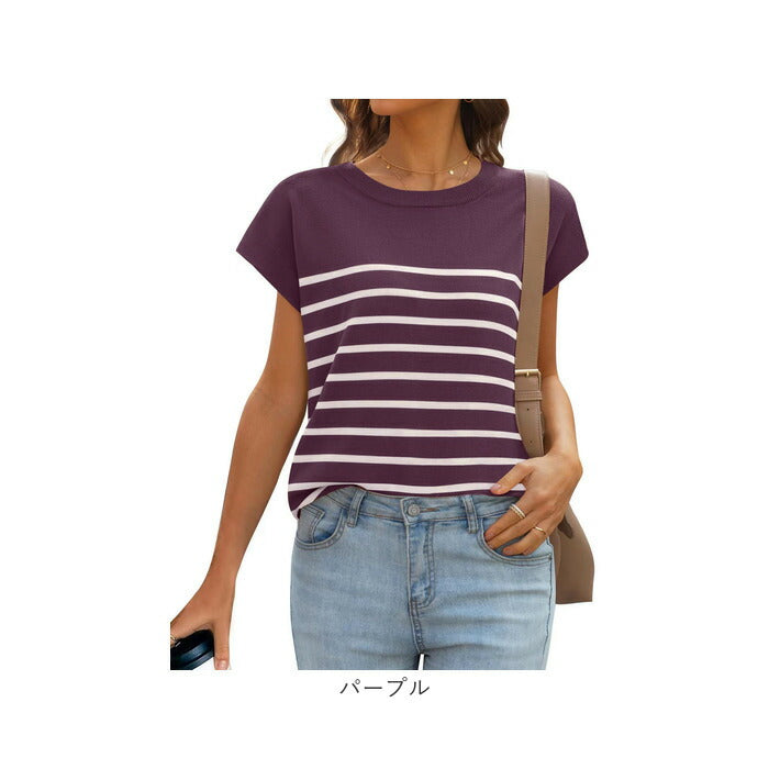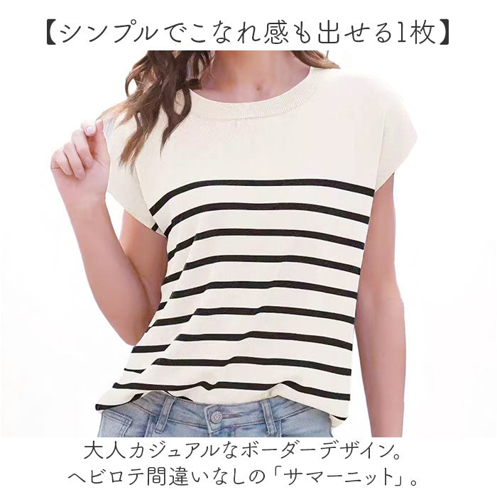 サマーニット レディース 通販 ニット 半袖ニット 半袖 女性 大人 ストライプ ニットウェア ボートネック トップス 通気性 快適 プルオーバー おしゃれ かわいい シンプル カジュアル