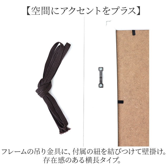 ・フレームの吊り金具に、付属の紐を結びつけて壁掛け。存在感のある横長タイプ。
