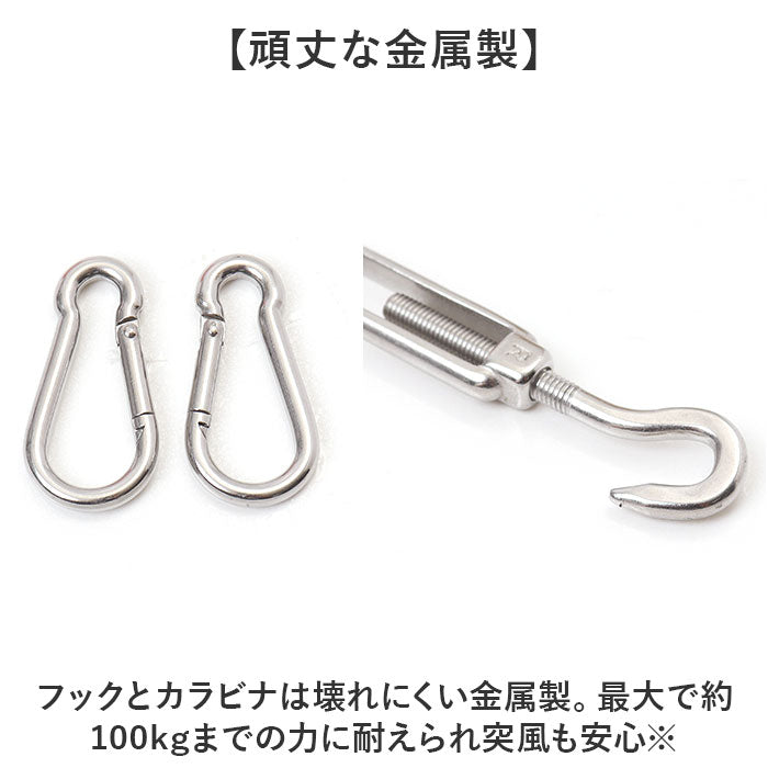 ・フックとカラビナは壊れにくい金属製。最大で約100kgまでの力に耐えられ突風も安心※