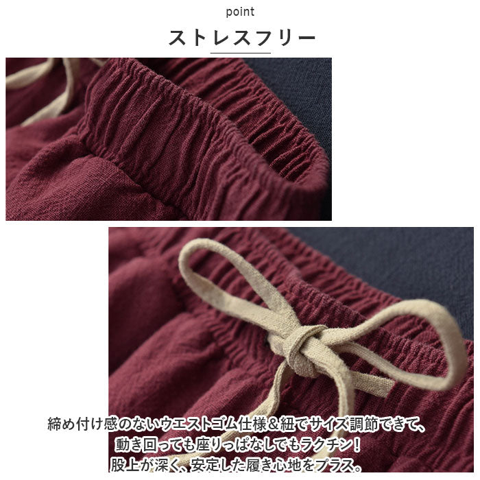 ・締め付け感のないウエストゴム仕様&紐でサイズ調節できて、動き回っても座りっぱなしでもラクチン!股上が深く、安定した履き心地をプラス。