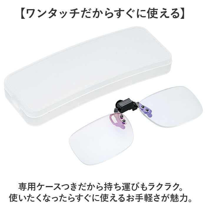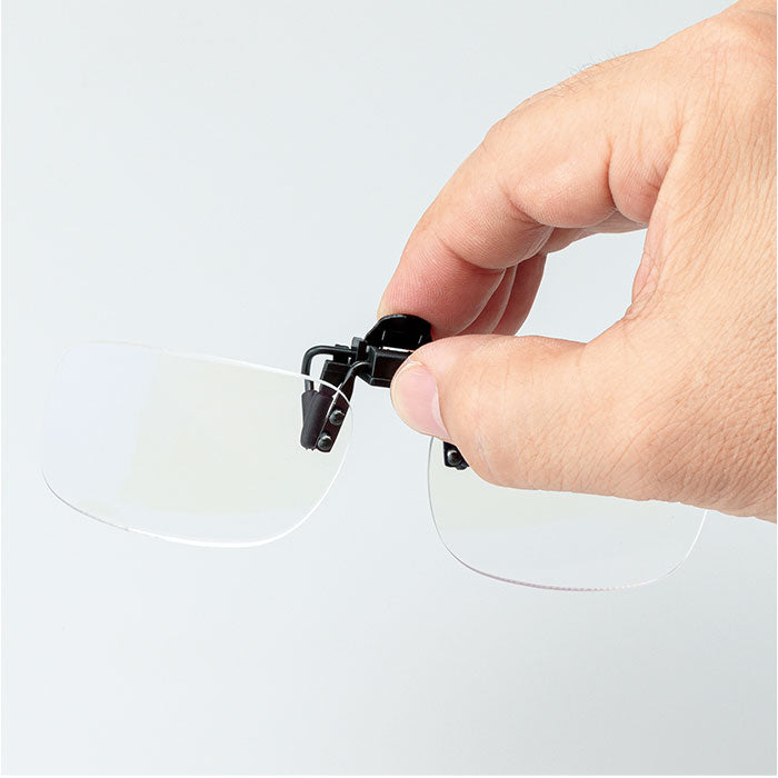 ・お手持ちのメガネにクリップを挟むだけ!跳ね上げ式だから着脱の手間が無く、ノンストレス!