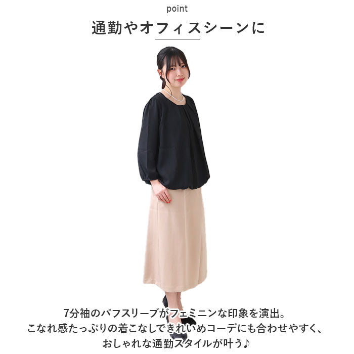 7分袖のパフスリーブがフェミニンな印象を演出。こなれ感たっぷりの着こなしできれいめコーデにも合わせやすく、おしゃれな通勤スタイルが叶う♪