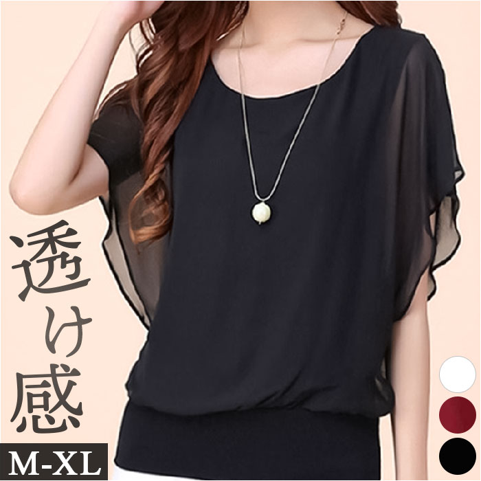 シフォン ブラウス 半袖 レディース 通販 襟なしブラウス フリル袖 オーバルネック ドルマンスリーブ シースルー おしゃれ シンプル 無地 女性 大人 オフィス フォーマル きれいめ