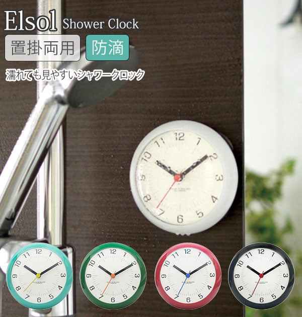 シャワー クロック Elsol エルソル 通販 掛時計 防滴 置時計 お風呂場 浴室 洗面所 洗面台 キッチン 台所 置掛両用 2way 吸盤 吸着 スタイリッシュ おしゃれ パラデック ライトブルー グリーン ダークレッド ライトグレー チャコールグレー バスクロック とけい クロック