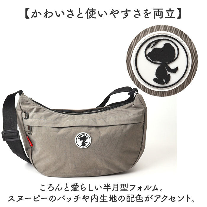 ・ころんと愛らしい半月型フォルム。スヌーピーのパッチや内生地の配色がアクセント。